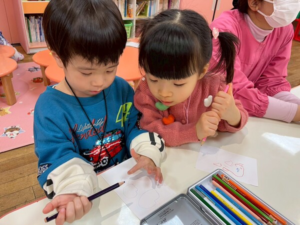 郵便局ではがきを買い、ママやパパ、お友だちや先生に宛てて手紙を書きました。スタンプを押してポストに投函するまでの流れを楽しみながら、子どもたちは集中して取り組んでいました。